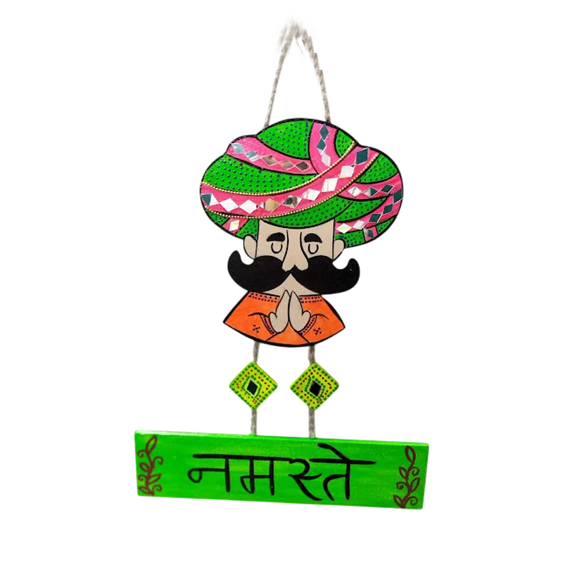 This hand-painted wooden hanging sign features a traditional Rajasthani man adorned in a vibrant turban, embodying the rich cultural heritage of India. The intricate mirror work enhances its aesthetic appeal, making it a captivating addition to any space. Customizable to suit individual preferences, this unique piece serves as a warm welcome sign, reflecting the artistry of traditional craftsmanship.