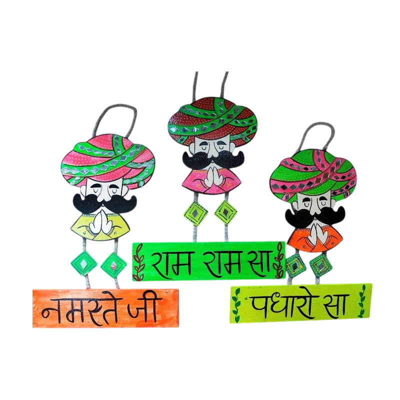 Rajasthai turban mas set of 3Enhance your home decor with this exquisite set of three handmade wooden hanging decorations, featuring vibrant colors and intricate mirror work. Each piece showcases the charming figures of a Rajasthani turban man, symbolizing rich cultural heritage. Handmade with meticulous attention to detail, these decorations are enhanced with stunning mirror work, reflecting light and adding a touch of elegance to your home. Perfect for enhancing your entryway or as a unique gift, this set not only serves as a decorative element but also as a conversation starter, inviting admiration for its artistry and cultural significance.